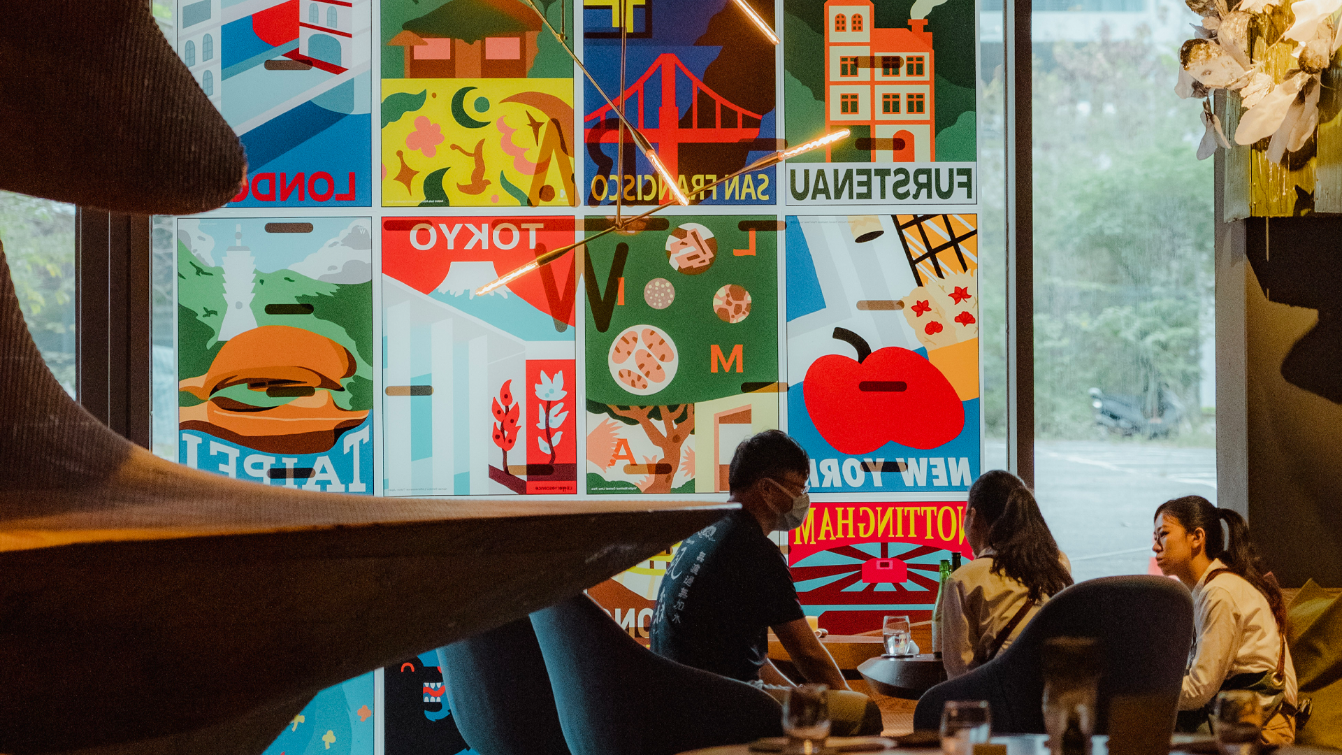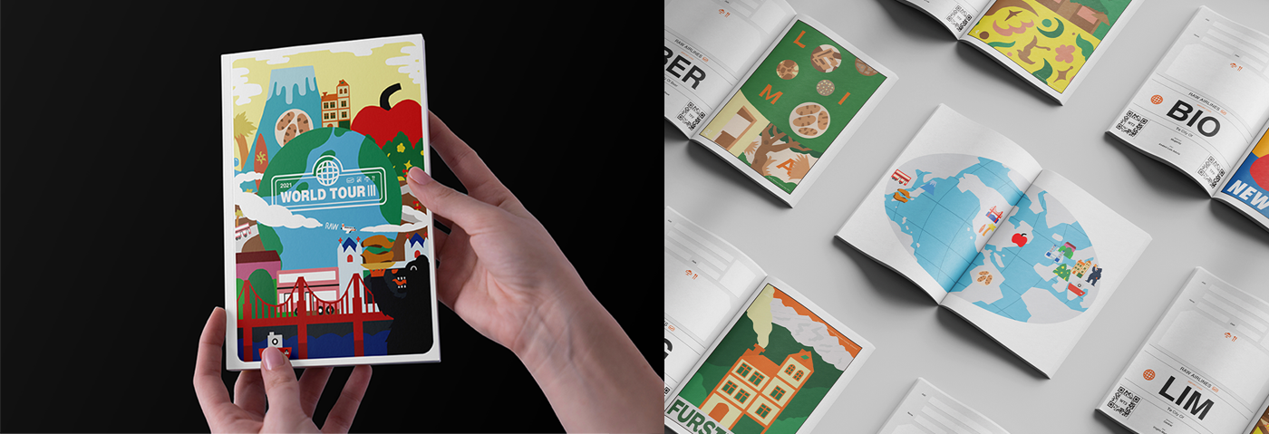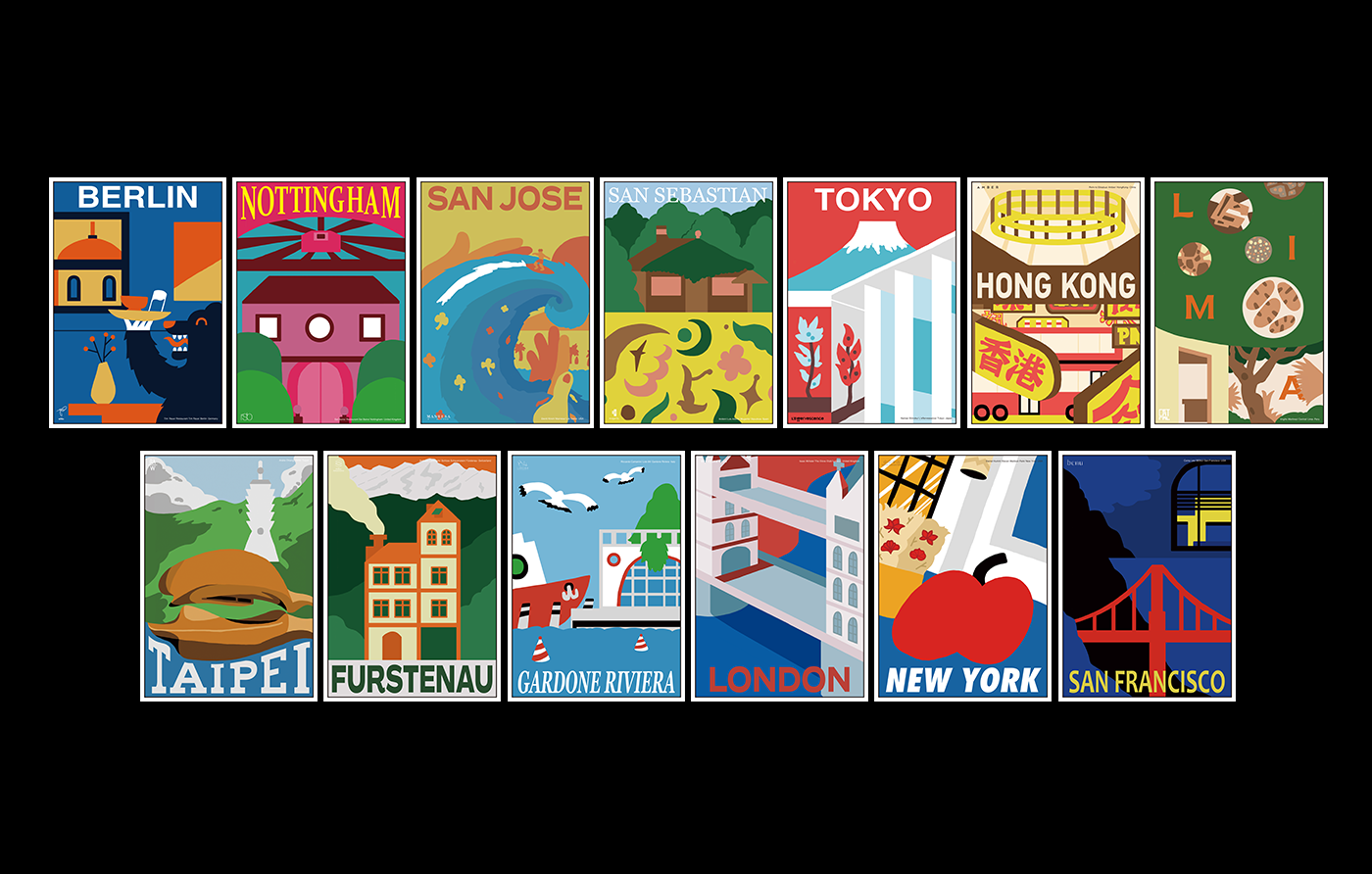 The postcard-like visual features a retro "Jet-age Fantasy" style, using large color blocks and collage to create a cute, flowy look. The imagery of each city was portrayed through distinctive color palettes and fonts. Symbolic elements of the city such as the Big Apple in New York, London Bridge in London, 101 in Taipei, etc., as well as the classic dishes and styles of each restaurant highlight the visual of "World Tour III", turning the dishes into a series of unique visual memories.