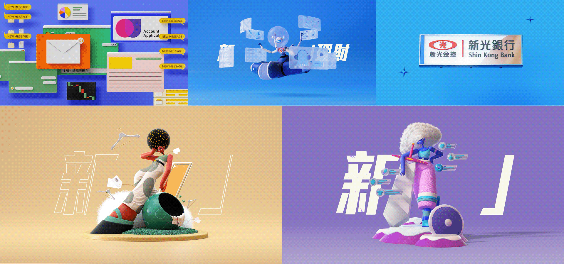「新」字被轉化為一個系統。打開右半邊的筆畫,形成如括號般的容器(Container)。隨筆畫開合可自由填入無數可能。展現新光銀行不僅是年輕世代有感的眾多新事物當中的其一,更圍繞著消費者組成數位金融新服務。動畫與實拍混合媒材手法,節奏強烈的剪輯與配樂給觀眾新的視覺體驗。