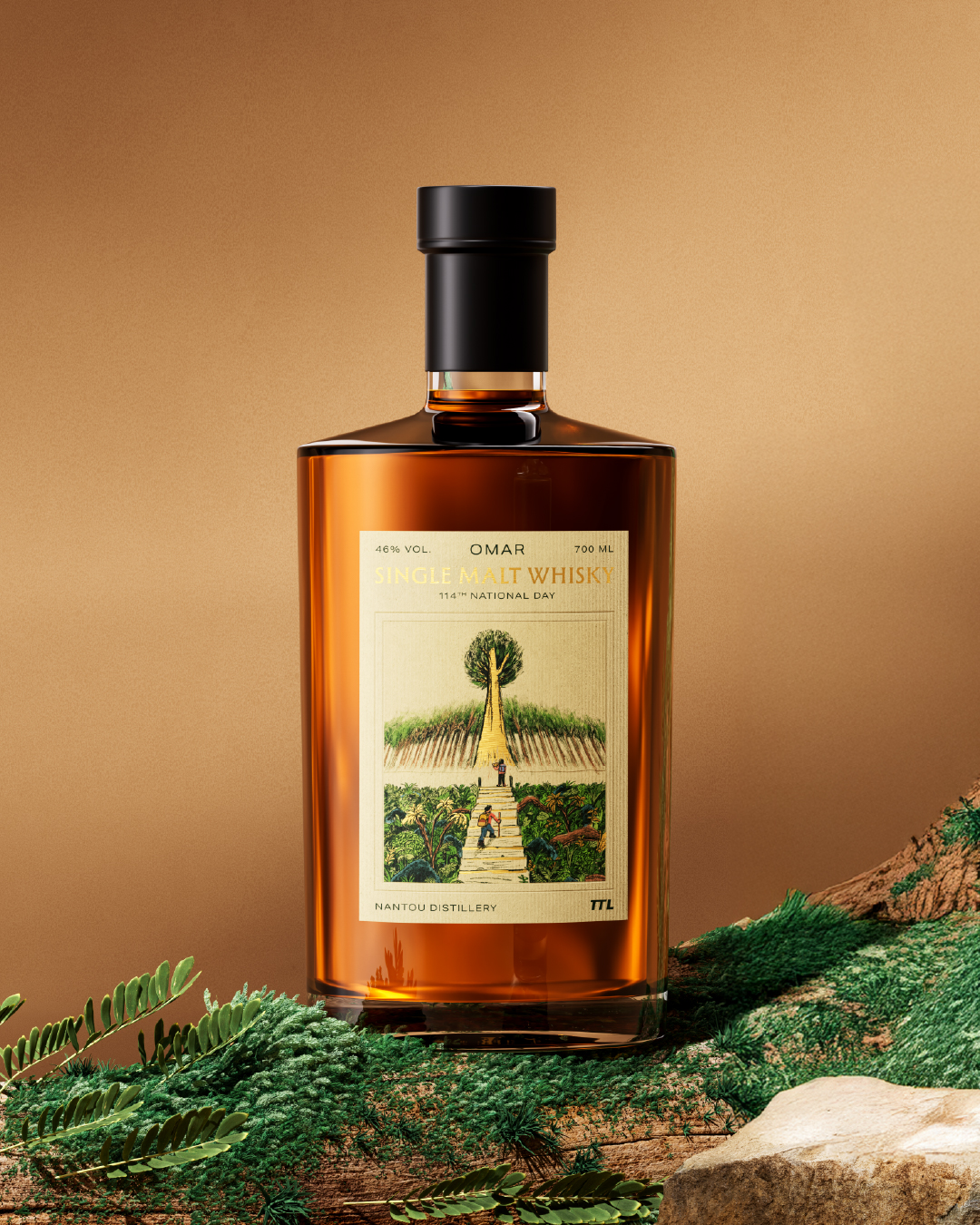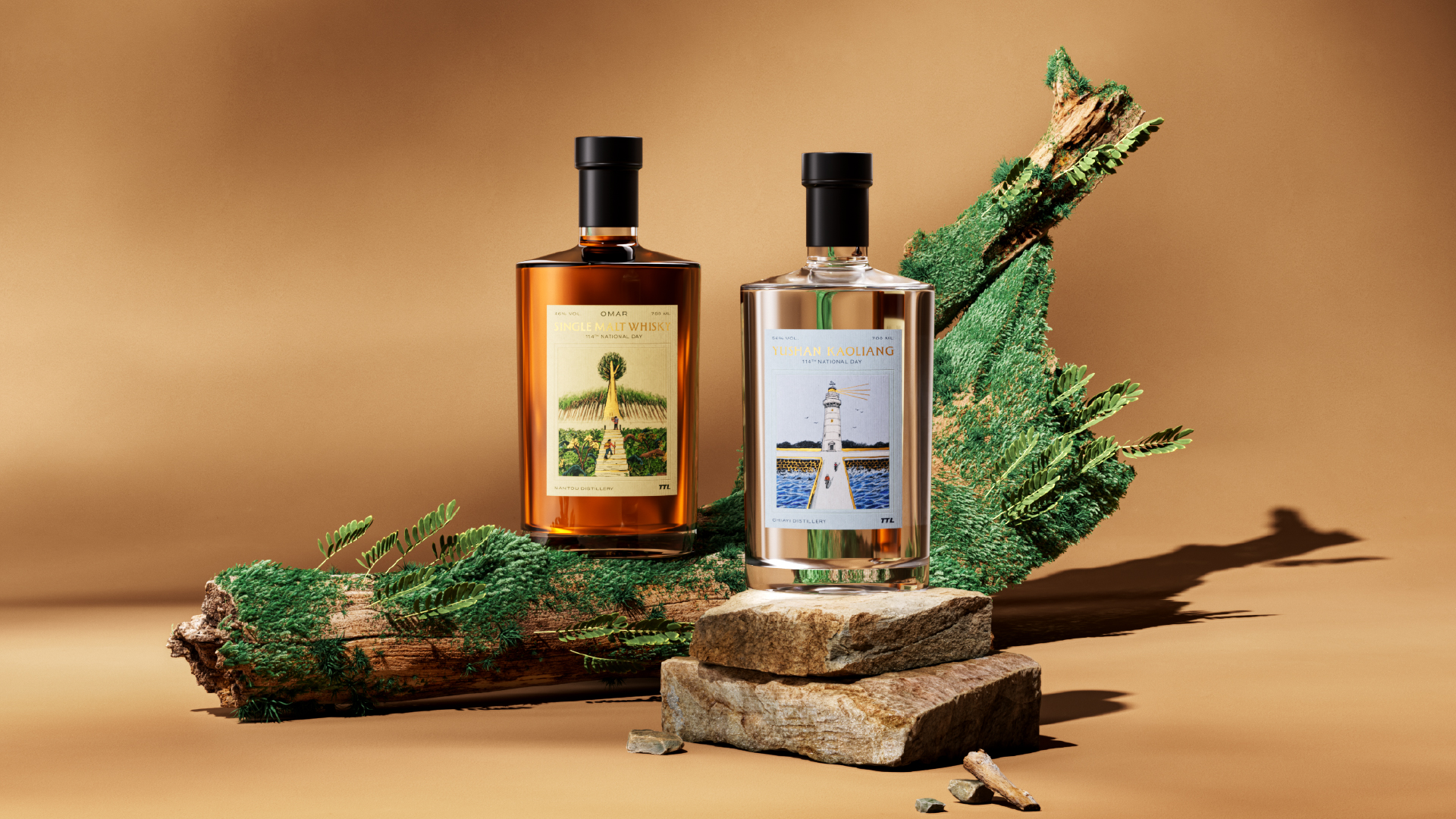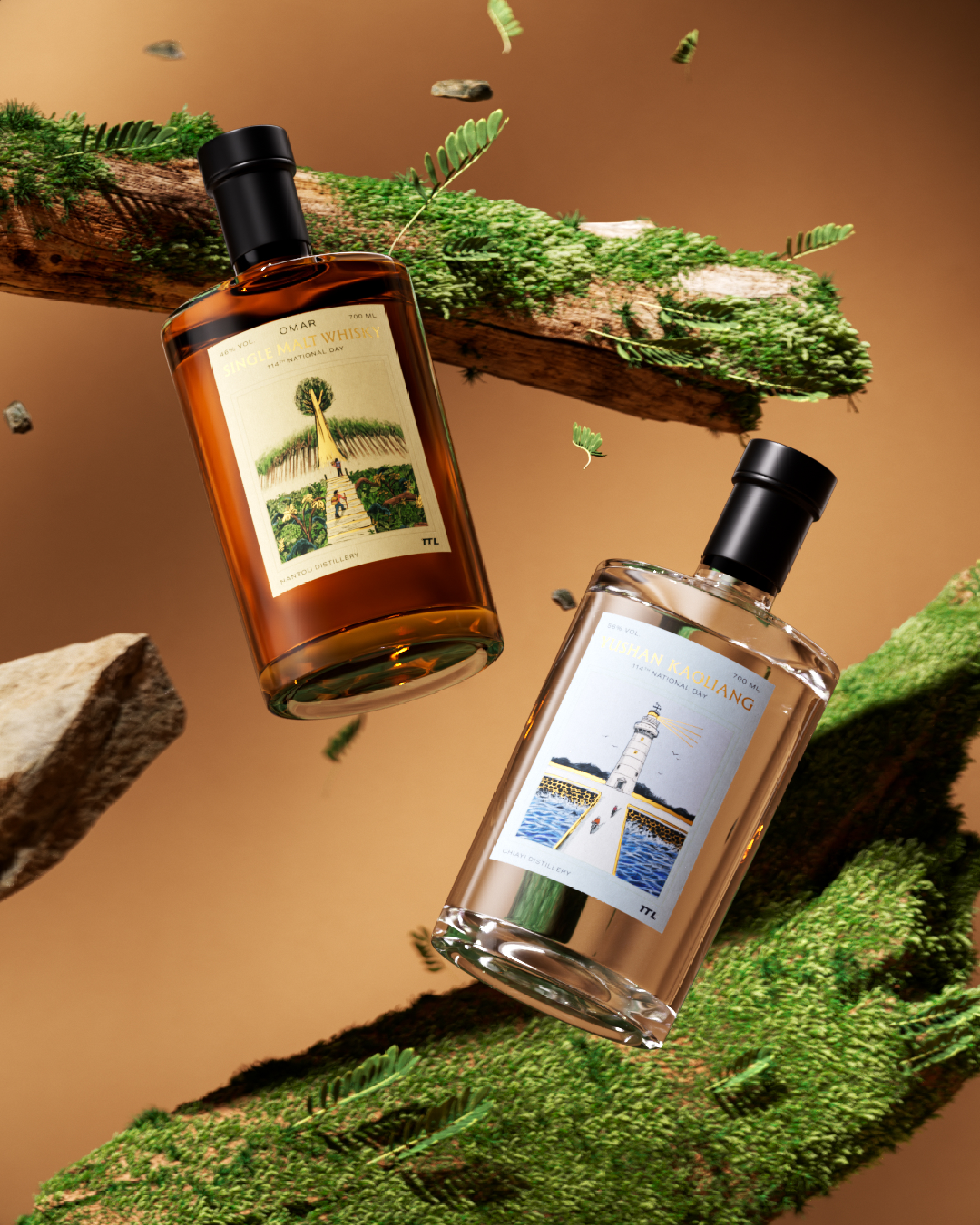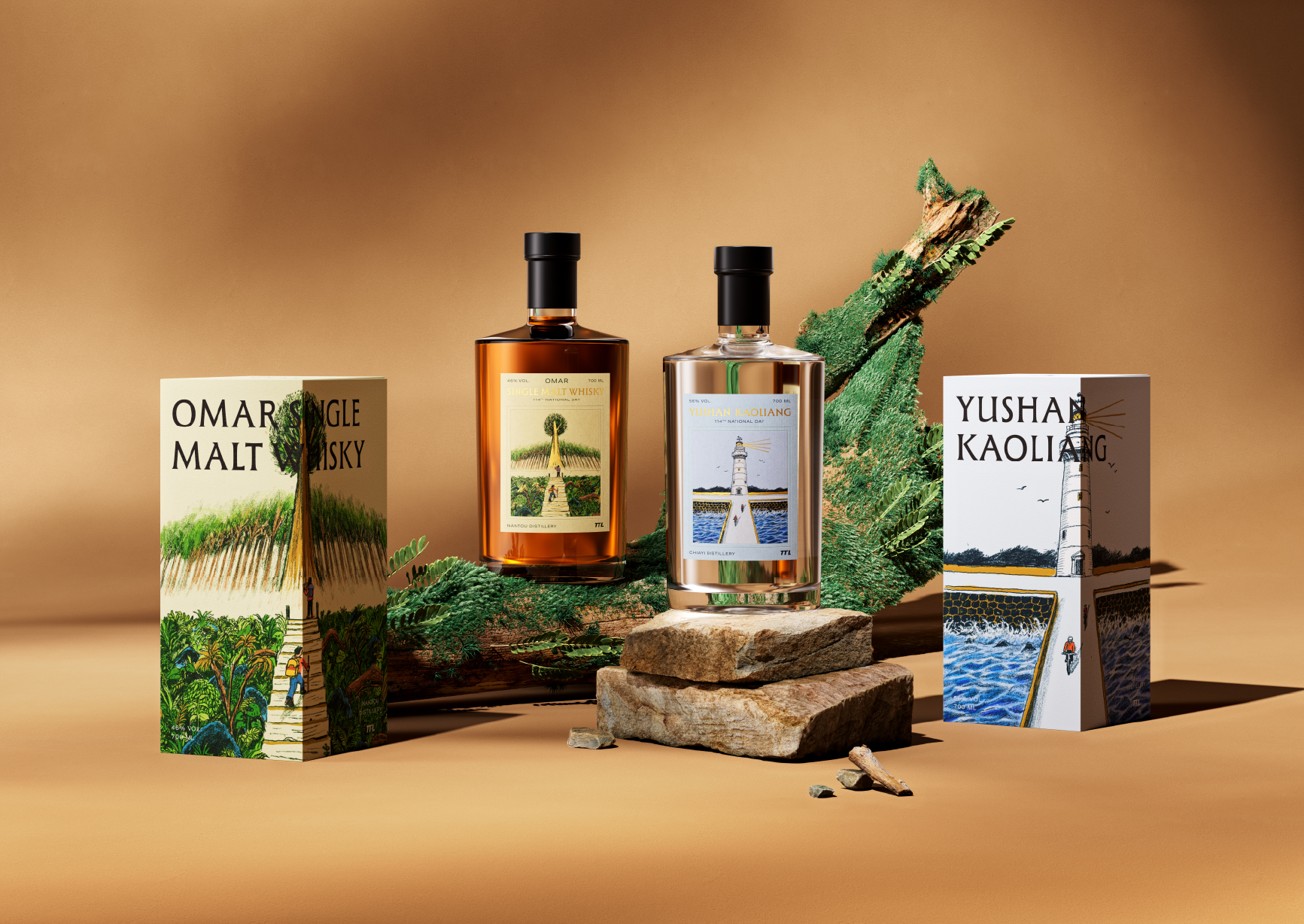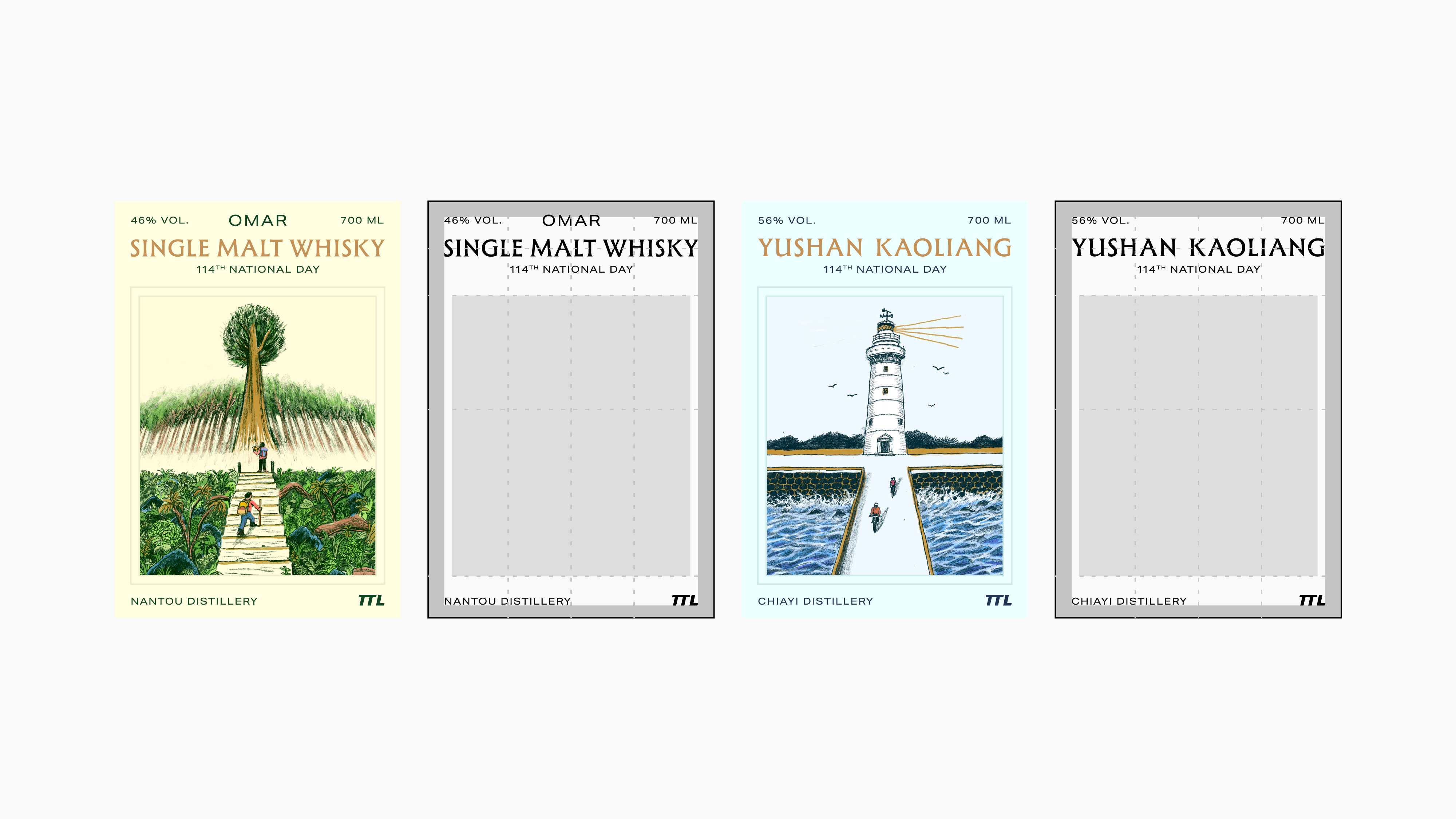OMAR單一麥芽威士忌酒標中的山景,靈感源自阿里山神木,神木靜立在雲霧之中,層層山徑拾級而上,彷彿走過時間留下的痕跡;玉山高粱的海景,取自鵝鑾鼻燈塔。鵝鑾鼻燈塔迎著海風矗立,百年間默默守望著島嶼。